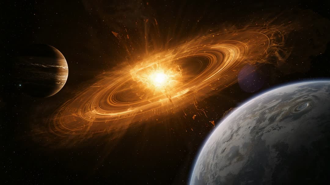 AI Generated Image. A breathtaking exploration of space featuring an erupting star surrounded by a luminous accretion ring. The scenario includes a gas giant and a rocky planet contributing to the impressive and dynamic cosmic scene. Perfect for use in educational materials about astrophysics, sci-fi illustrations, and content related to space exploration and astronomy to inspire wonder in celestial dynamics.