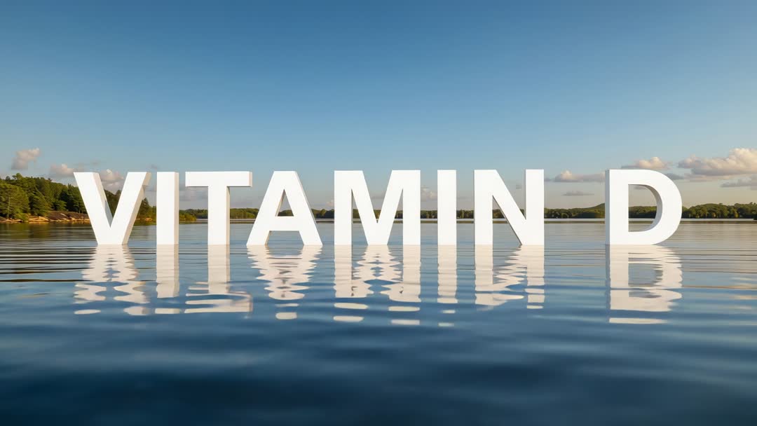 AI Generated Image. Moving low-angle camera centering massive VITAMIN D letters floating on lake, producing realistic reflections and soft ripples across water. Capturing warm golden hour light and tranquil horizon, offering strong horizontal composition and ample sky space for text or logo placement. Serving as dynamic opener for vitamin supplement commercials, wellness brand promos, sunscreen campaigns, environmental health videos, social media reels, website hero loops, presentation intros. Working well for 4K and HD projects, enabling smooth animation transitions and easy color grading, fitting advertising, editorial, and branding projects focused on sun exposure, outdoors, and preventive health.
