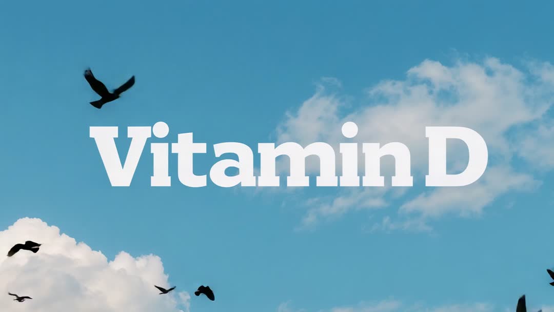 - Vitamin D text overlay with birds flying across sunny blue sky and drifting clouds