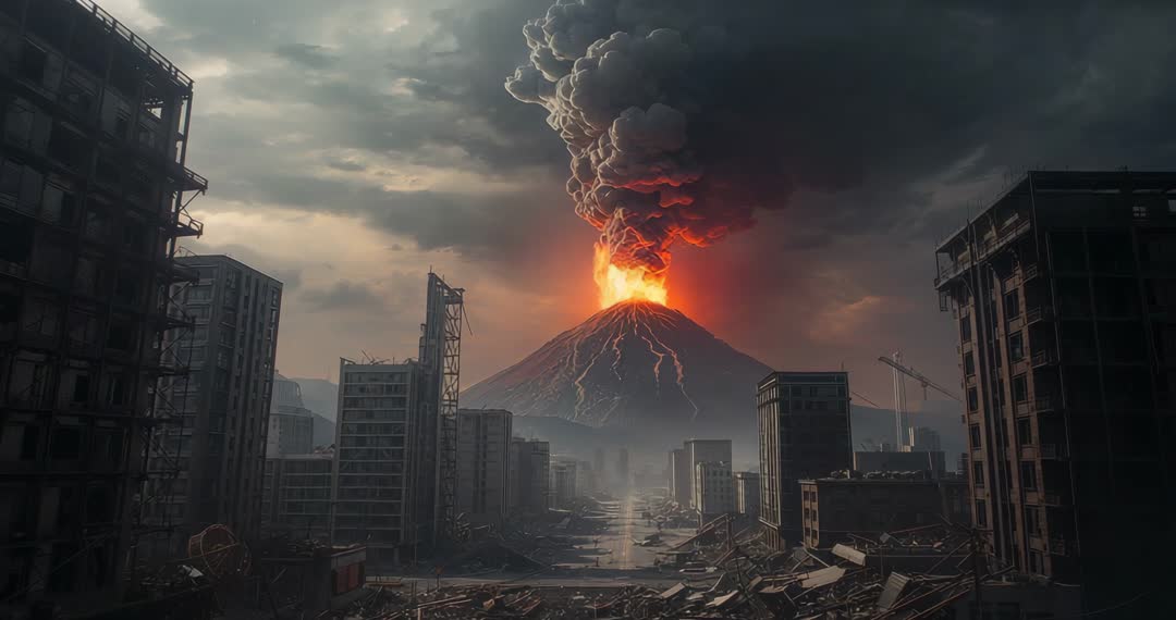 - Volcanic Eruption Devastates Urban Landscape with Lava and Ash