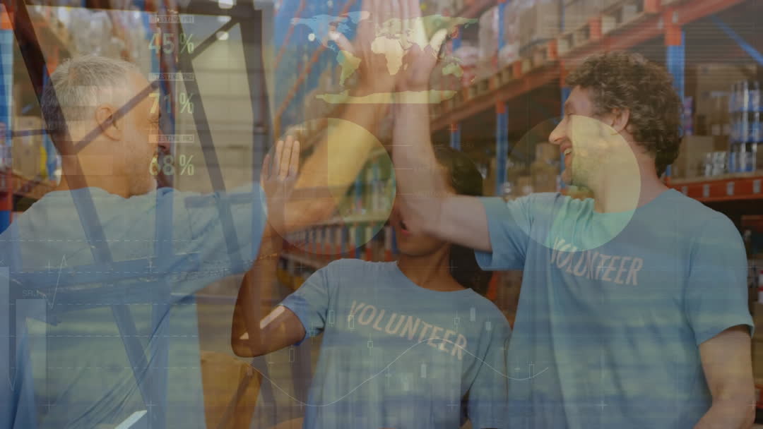 - Volunteers Celebrating Achievement in Warehouse with Financial Data Overlay