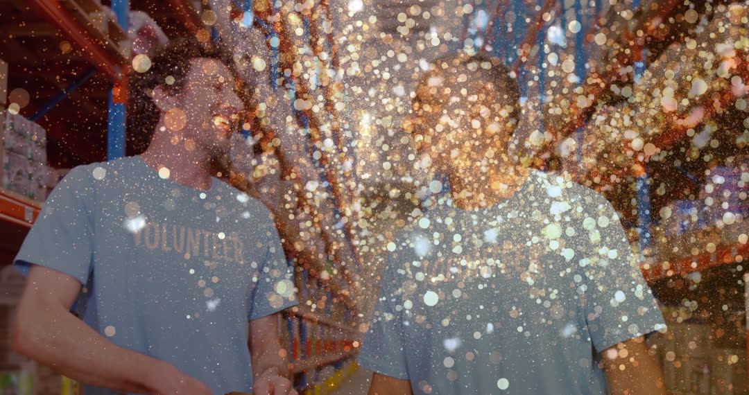Image shows volunteers working in a warehouse, smiling and interacting. Festive sparkle overlay adds excitement and joy, symbolizing teamwork and community spirit. Suitable for depicting volunteer projects, teamwork inspiration, or festive corporate events.