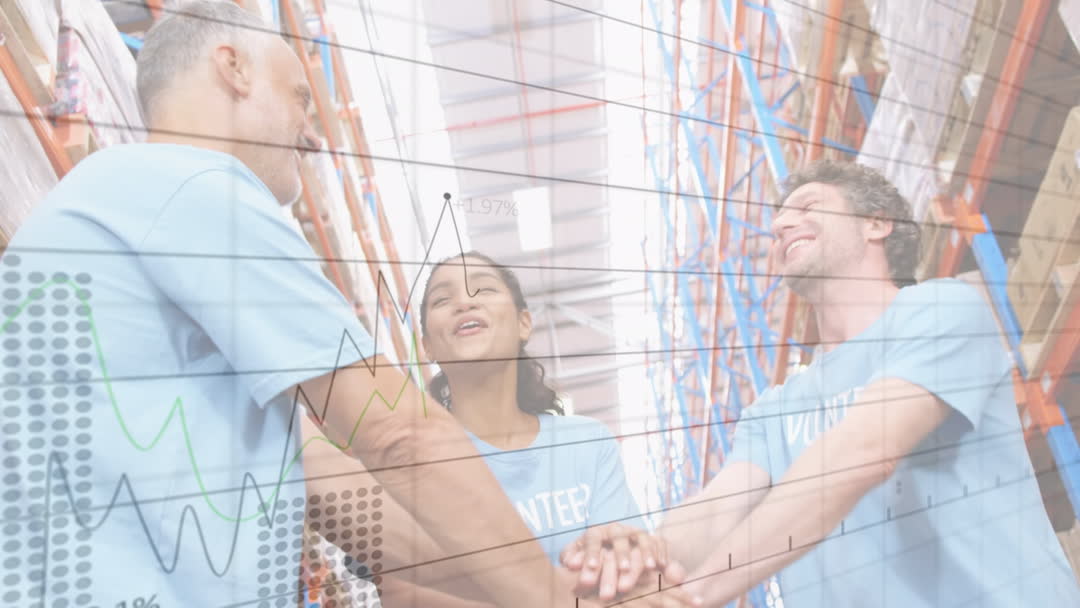 People from diverse backgrounds are joyfully joining hands, surrounded by tall shelves in a spacious warehouse painted in data processing animations. Concept covers charity, community, cooperation, goal achievements, and celebrates future projections. Ideal for illustrating community engagement, logistics success, nonprofit organizations or teamwork sentiments