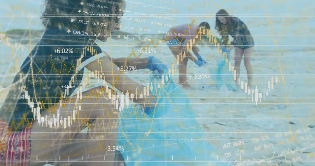 Visual highlights dedication to environmental conservation with diverse volunteers cleaning a beach alongside overlay of financial data and graphs indicating activity measurement or technological impact on ecological conservation. Useful for campaigns or presentations emphasizing connection between sustainable practices and modern analysis or highlighting ecology and data analysis interaction.