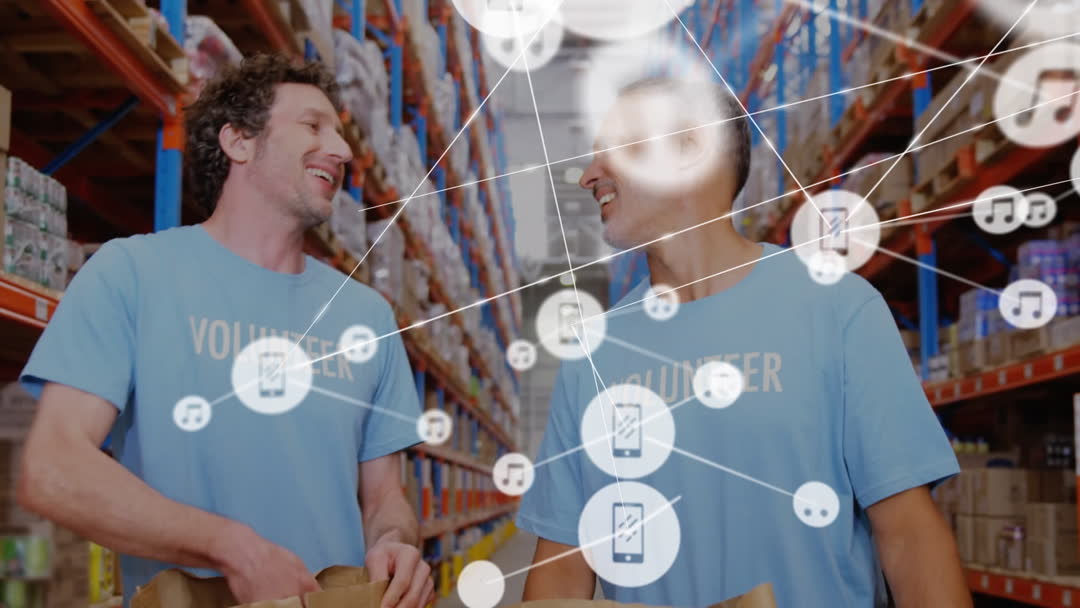 Two volunteers actively engaging in charitable activities in a warehouse setting, surrounded by symbols representing communication and connectivity. Ideal for illustrating themes of teamwork, dedication, and effective communication in philanthropic contexts. Suitable for use in community service campaigns, corporate social responsibility promotions, or projects highlighting volunteer work.