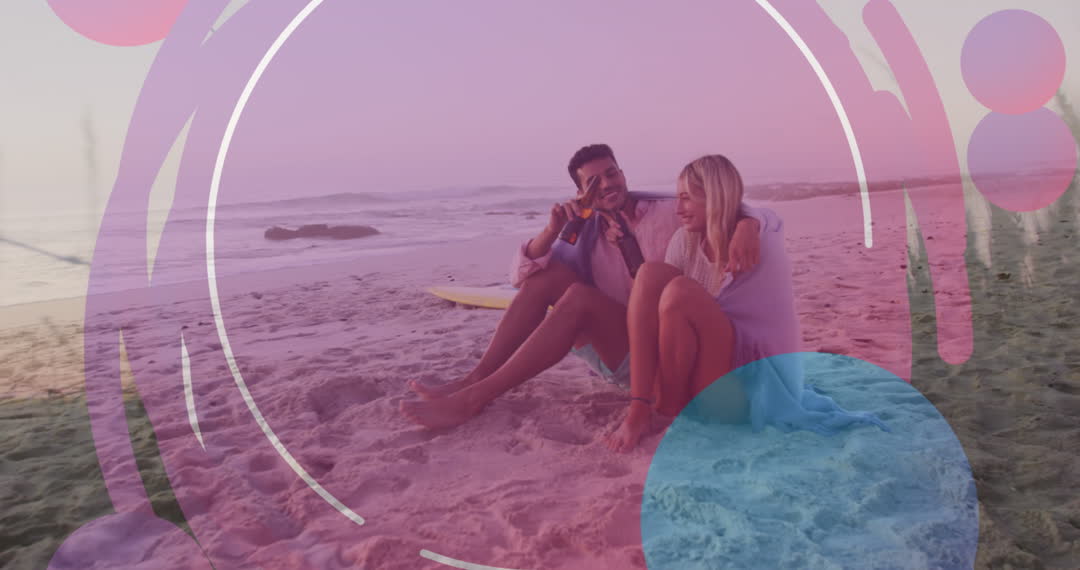 The video features two individuals engaged in an environmental clean-up, symbolized through additional digital globe icons, as they work together during a beautiful beach sunset. This presents volunteering and community effort in protecting the environment. Use for promoting beach conservation campaigns, volunteer recruitment events, or environmental sustainability initiatives.