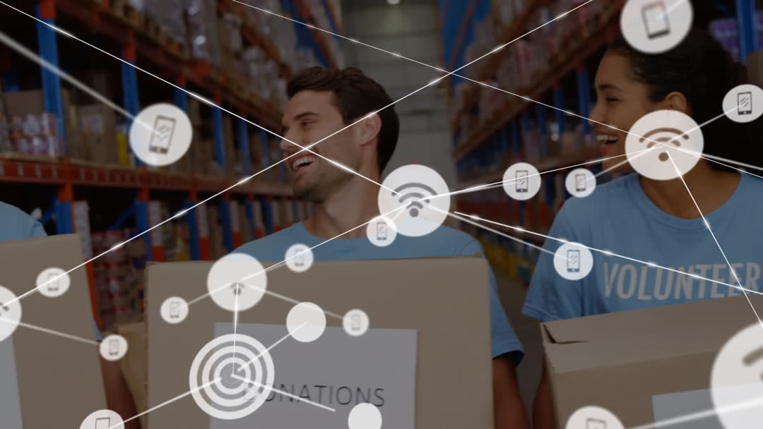 A diverse group of volunteers smiling and carrying donation boxes in a busy warehouse, overlaid with digital network and technology icons symbolizing connectivity. This illustration represents the integration of digital technology in real-world logistics and teamwork. Ideal for use in contexts related to global networking, innovative logistics solutions, team collaboration, and philanthropy projects leveraging digital techniques.