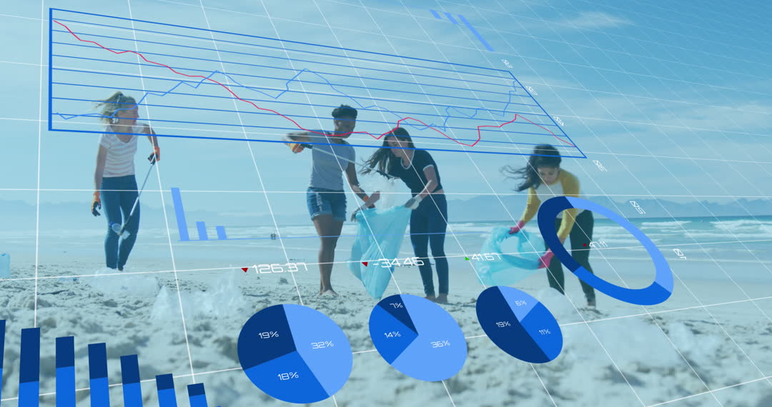 Scene shows a group of diverse volunteers cleaning a beach, with digital graphics including charts and graphs overlaying the video. Meant to represent a combination of ecological actions and digital technology. Useful for environmental campaigns, presentations on ocean conservation, or illustrating data-driven environmental projects.