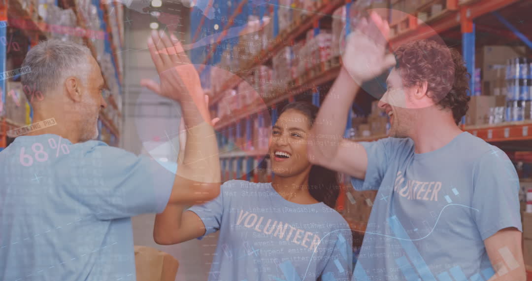Volunteers in a warehouse are high-fiving joyfully, representing teamwork and collaboration in a setting dedicated to global shipping or aid provision. Overlay of financial data graphics adds a layer of technological sophistication, blending human effort with digital progress. Use in narratives around volunteer work, technological innovation in logistics, or global collaboration initiatives.