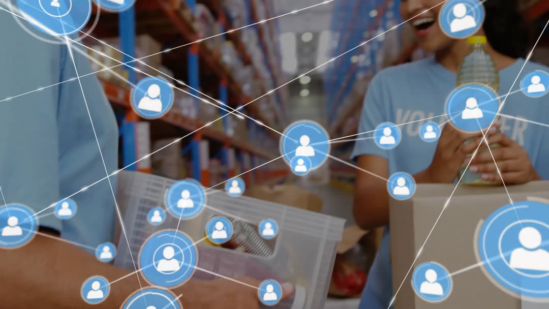 - Volunteers packing donations in warehouse with digital network overlay showing nonprofit teamwork