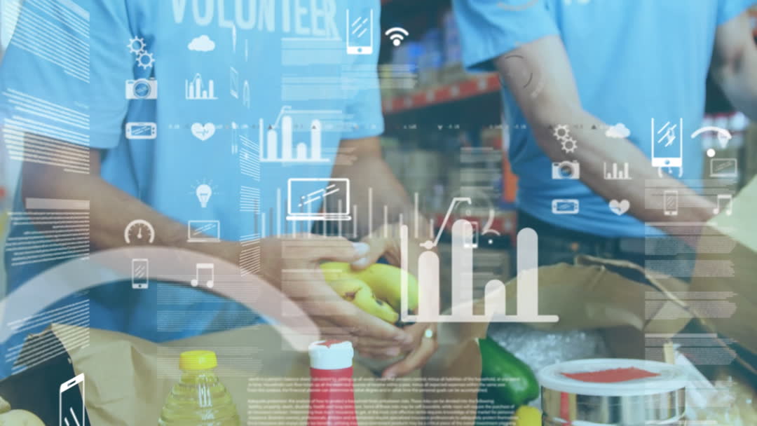 Volunteers seen busy handling goods in a warehouse, symbolizing teamwork and community service, with a digital data processing overlay showing charts and icons. It represents the integration of technology in modern volunteer efforts and logistics. Useful for depicting themes of charity, digital transformation, and global shipping advancements.