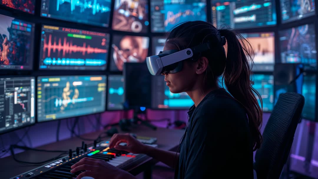 AI Generated Image. Video showing woman producer wearing VR headset and interacting with MIDI controller and compact keyboard, updating waveforms and track meters across wall of monitors. Lighting featuring blue and magenta neon, creating moody futuristic atmosphere with cinematic side-profile framing and visible hands on hardware. Workspace including multiple DAW screens, waveform displays, and mixing panels, offering copy space on left side for text overlays or lower-third graphics. Suitable for illustrating VR music production, immersive audio workflows, electronic composition, music technology marketing, product demos, online course thumbnails, YouTube tutorial intros, album promotion, and creative portfolio reels. Ideal for tech startups, music schools, artist branding, UX case studies, and advertising campaigns focused on innovation and creative tools.