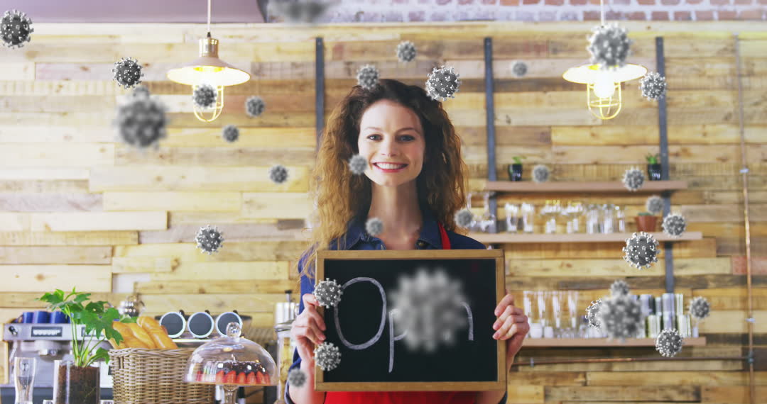 This video depicts a smiling waitress holding an 'open' sign in a cafe setting, with digitally animated virus cells overlaying the scene, symbolizing reopening during the COVID-19 pandemic. It can be used in articles or campaigns related to business adaptations, COVID-19 safety protocols, or hospitality industry recovery efforts.