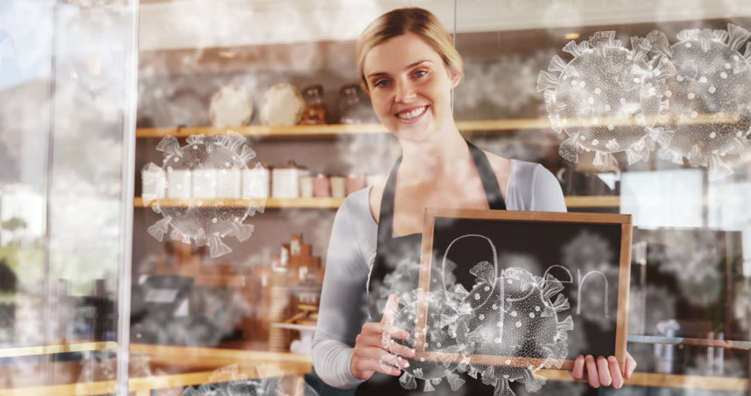 Waitress standing in a cafe, holding an open sign with animated virus cells in view. Captures the impact of the COVID-19 pandemic on the hospitality industry and business reopening challenges. Suitable for topics on pandemic safety measures, the business impact of COVID-19, and health protocols in public services.