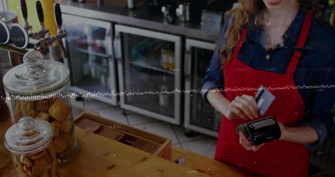- Waitress in Cafe Swiping Card with Digital Data Overlay