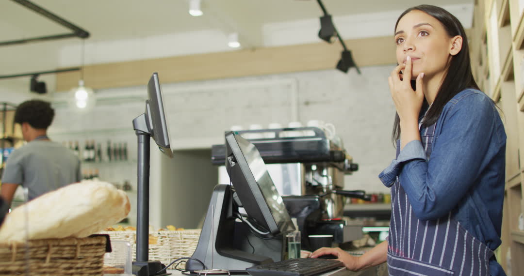 - Waitress Using Cash Register in Cozy Coffee Shop