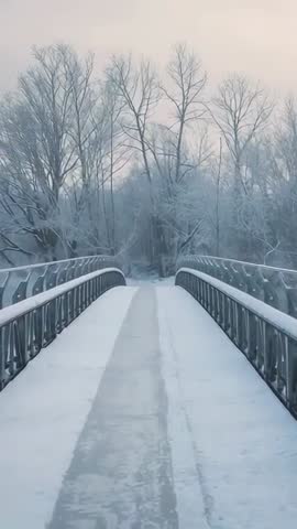 AI Generated Video. Showing long iron bridge covered in fresh snow, leading straight toward frosted trees under soft pastel sky. Narrow cleared track down center of walkway creating strong leading lines and deep perspective. Bare branches with rime frost creating delicate textures against muted winter light. Vertical framing emphasizing height of trees and receding pathway, making clip ideal for mobile-first content. Suggested uses: mobile social posts, Instagram Reels, TikTok storytelling, vertical ads, website hero video, travel and nature channels, seasonal greetings, meditation and mindfulness apps, winter sale promotions, cinematic openers. Creative tips: adding minimal overlay text or logo in upper area, applying gentle cool-blue color grade, adding ambient piano or wind sounds, slowing playback for calming loop. Licensing notes: clean scene with no people or identifiable property, suitable for commercial and editorial uses.