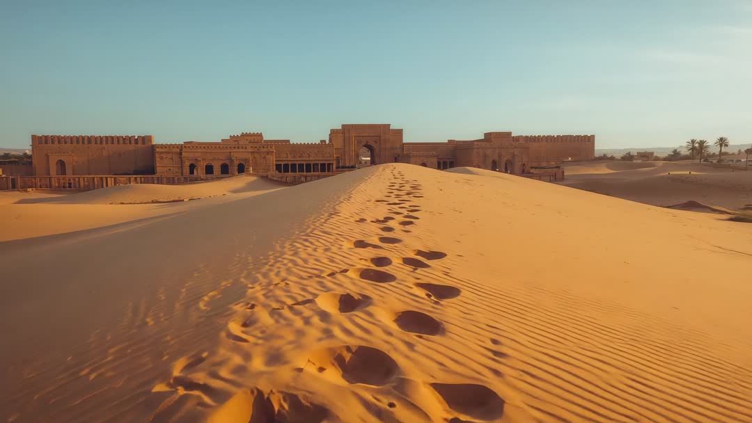 AI Generated Image. Camera panning forward along sand dune ridge revealing deep footprints leading toward ochre fortress with arched gateway under warm golden light. Long shot offering strong foreground, midground, background layers with sweeping desert expanse and distant palms. Footprints creating natural leading line guiding viewer eye toward gateway and horizon. Ideal usage for travel openers, documentary sequences, tourism promotions, adventure commercials, website hero banners, book covers, social media reels. Scene working well for storytelling about exploration, solitude, history, desert architecture, pilgrimage. Color palette delivering warm ochre tones and soft sky blues, facilitating text overlay and cinematic grading.