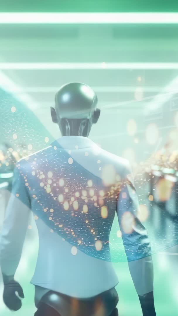 AI Generated Image. Featuring humanoid robot walking through glowing corridor with holograms activating across torso and shoulders and cyan eyes scanning pods. Supporting technology presentations, enhancing startup promo videos, illustrating product demos, explaining industrial automation, complementing medical research visualizations, enriching sci-fi trailers, powering social media vertical reels. Working well with overlay text on upper third and left margin, supporting bold title cards and lower thirds. Providing loop-friendly motion and abstract bokeh elements for seamless transitions and branding intros. Offering cinematic cyan color palette suited for futuristic, clinical, or corporate tech themes.