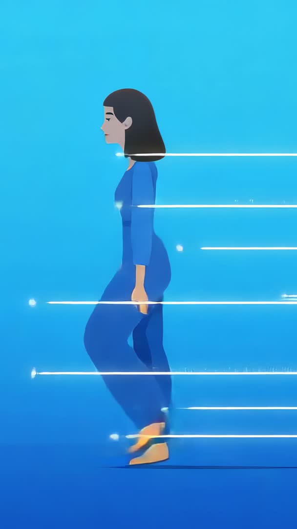 AI Generated Video. Vertical video showing woman walking in side profile across blue gradient while horizontal glowing streaks and particles passing through frame, suggesting speed, transition, motion blur. Character wearing blue tunic and neutral expression walking with steady stride, creating calm yet dynamic mood. Minimal flat illustration style with soft lighting and subtle spark particles fitting for modern tech, wellness, fashion, personal growth themes. Use for app intro, transition between scenes, social media vertical ads, Instagram Reels, TikTok clips, corporate presentations, explainer videos, website hero loops. Looping-friendly animation and clean composition allowing easy overlay of text, logo, call-to-action. Color palette and motion energy supporting branding, UX mockups, visual storytelling.