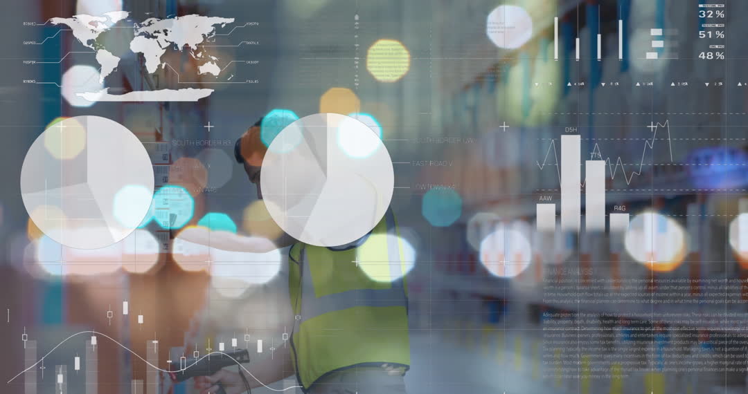 A male worker in a warehouse environment engaged in modern data processing and analytics. Overlay of various graphs and charts illustrates integration of technology with logistics and inventory management. Useful for portraying concepts related to digital transformation, business intelligence, and efficiency in supply chains.