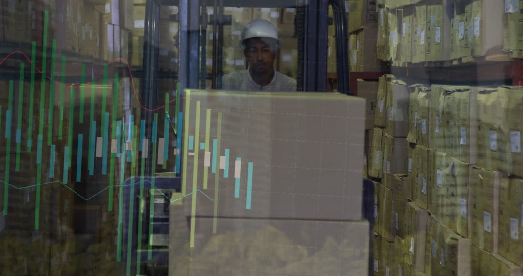 Overlay of financial graphs with a warehouse themed background, featuring a forklift operator among shelves filled with boxes. Ideal for illustrating concepts related to logistics management, inventory tracking, and the integration of data analytics in supply chain operations.