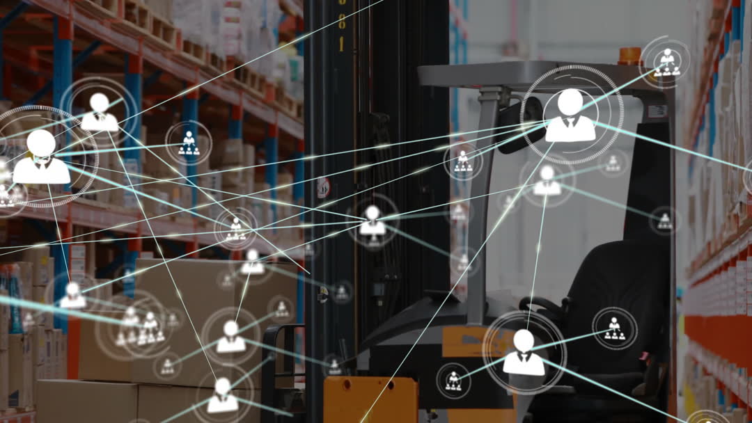 Warehouse environment showing interconnected network graphics representing data movement and workforce interaction in logistics. Provides insights into how automation and networking technologies streamlining inventory distribution processes. Useful for illustrating modern logistics automation systems, concepts of networked workforce operations, and data-driven warehouse management.