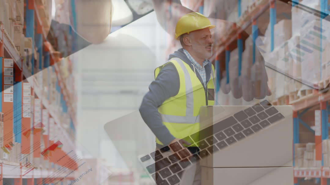 This creative video combines elements of a Caucasian warehouse worker in a safety vest and hard hat with digital technology, showing a hand utilizing a laptop. It reflects the intersection of traditional labor and modern tech. Ideal for promoting articles discussing automation in logistics, technology in warehouses, or digital transformation in supply chains.