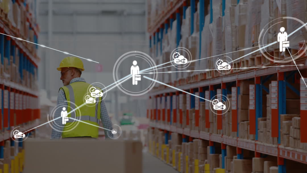 Visually depicting the integration of modern network technology in a warehouse environment, showing a person wearing safety gear surrounded by various digital icons suggesting connectivity and logistics operations. Useful for illustrating concepts in supply chain management, digital transformation in industries, and smart warehouse solutions.