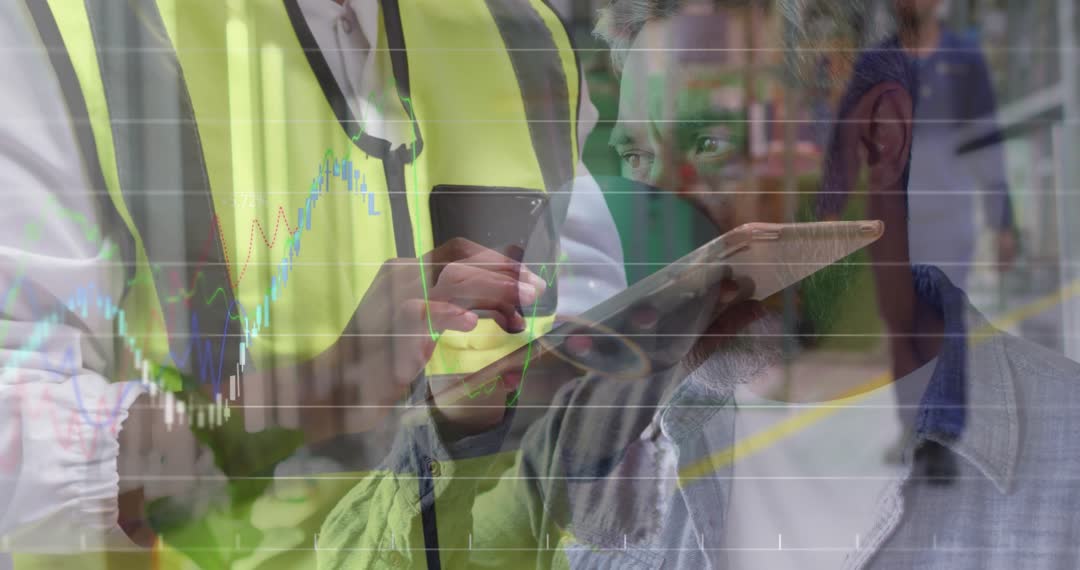 - Warehouse Coworkers Using Technology with Financial Data Overlay