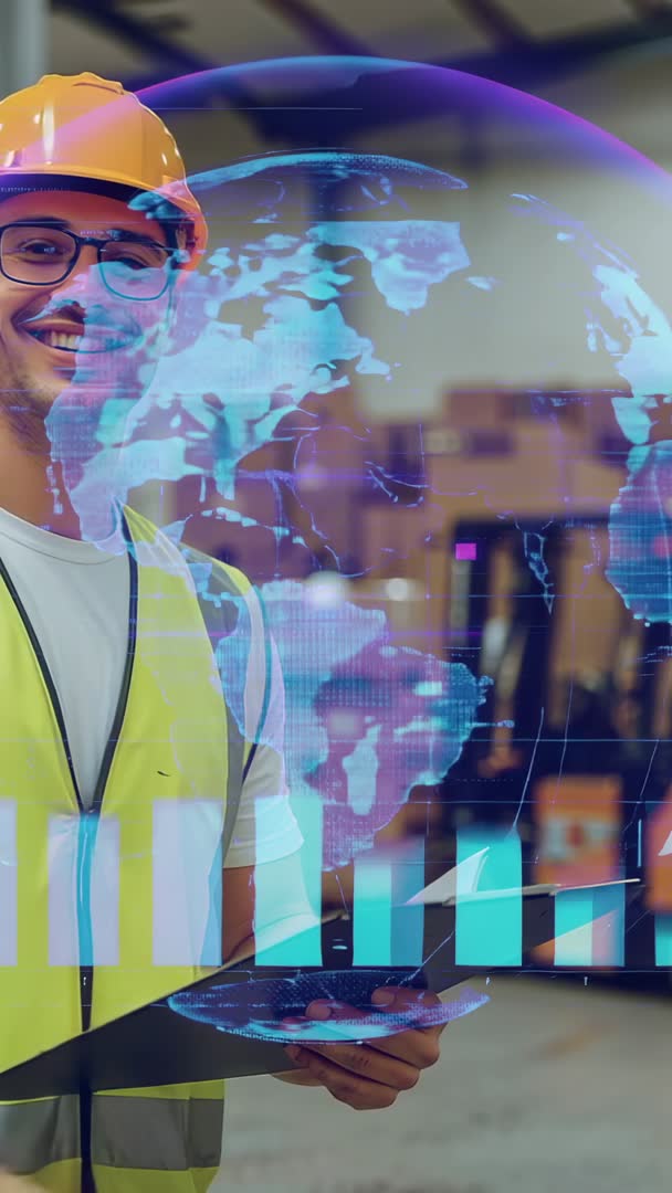 AI Generated Image. Vertical video showing warehouse worker wearing hard hat and safety vest, reviewing inventory on tablet while holographic global map and analytics overlay float across frame. Bright industrial background providing subtle depth and copy space on right side for text, logos, or lower-third stats. Footage highlighting real-time data visualization, global distribution links, and inventory performance metrics for modern logistics workflows. Use cases include logistics presentations, supply chain analytics promos, ecommerce fulfillment marketing, industrial automation demos, corporate technology landing pages, training modules, and mobile vertical ads. Editing tips: place branded text and call-to-action on right-side copy space, animate chart bars to match voiceover, adjust hologram color palette to match brand identity, and crop for social vertical formats. Visual themes include global connectivity, digital transformation, real-time analytics, inventory optimization, and technology-driven operations.