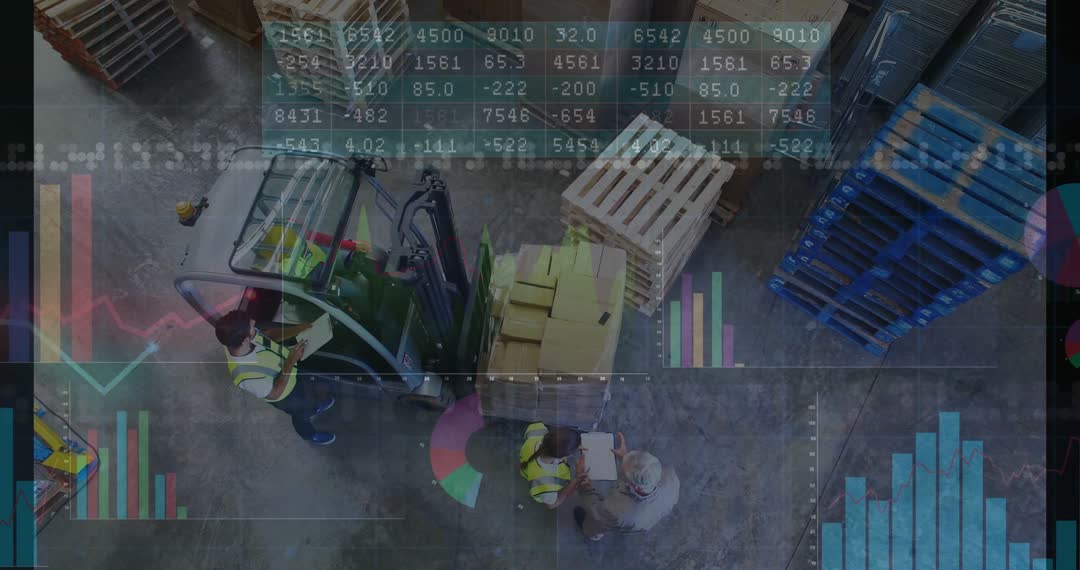 Image of forklift operator lifting pallet loaded with boxes as a colleague checks inventory, reflecting impressive efficiency and teamwork. Vibrant overlay of charts and data signifies voluminous logisticivity and insightful inventory management. Suitable for communications on industrial efficiency, operational safety, inventory analytics, logistical optimizations and advances in modern supply chain management technology.