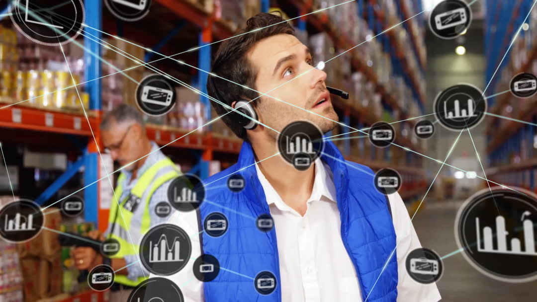 Warehouse workers utilize technology for efficient inventory management, surrounded by digital connectivity icons. Perfect for illustrating modern logistics, supply chain innovation, and technology in warehouses. Suitable for articles on improving warehouse operations through digitization.