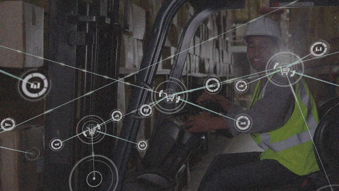 African American worker operating forklift in large warehouse with digital icons representing blockchain technology visualized in foreground. Concept showcases integration of innovative tech in logistics, aiding in efficient supply chain management. Ideal for articles on advanced warehouse solutions, blockchain applications in logistics, or efficient inventory systems.