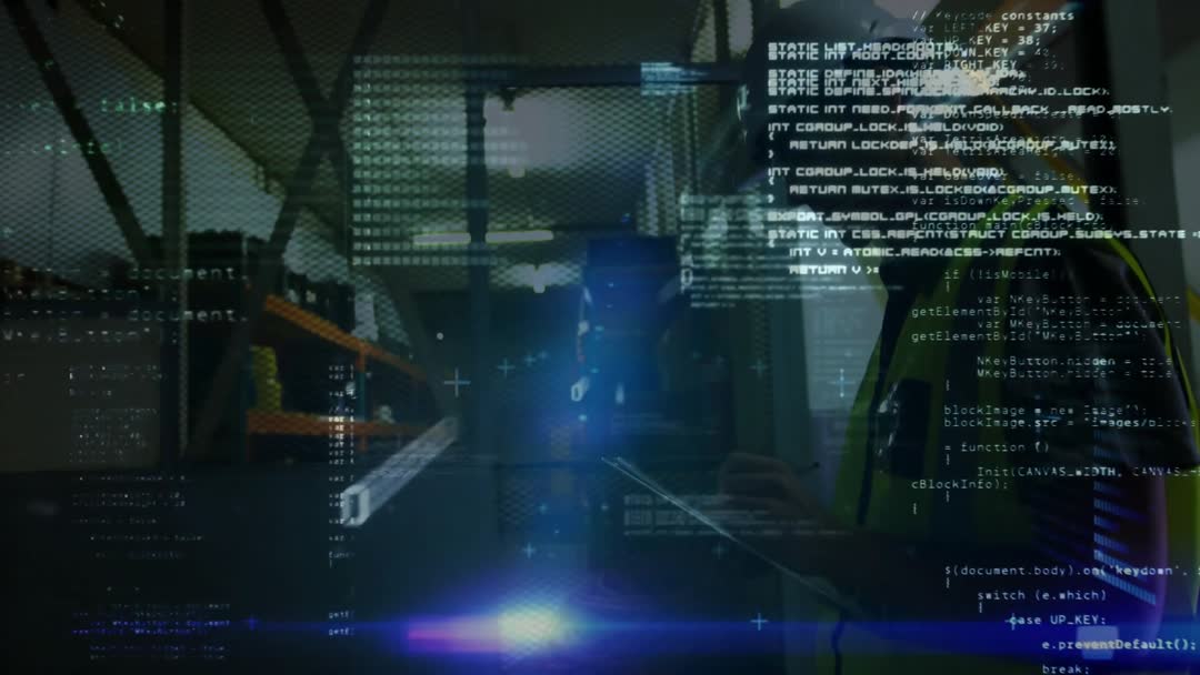 Image captures the intersection of traditional industrial work with advanced data techniques, showing a person in a safety vest inspecting inventory with overlaid technology and code elements. Ideal for illustrations in supply chain automation, industrial data integration manuals, or presentations on leveraging technology in logistics and inventory management solutions.