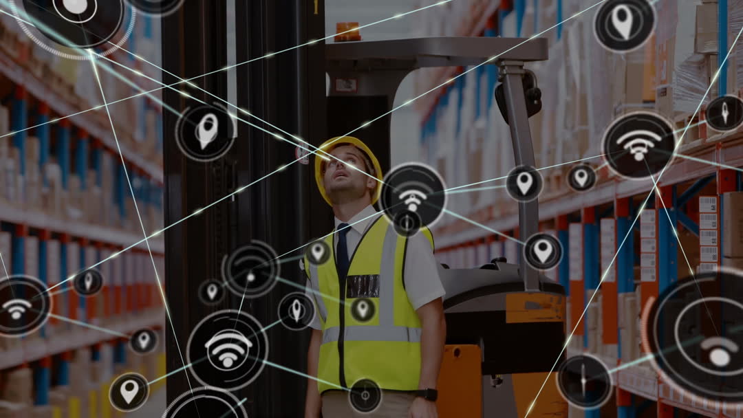 Caucasian worker in high-visibility vest operating in modern warehouse with digital network overlay representing smart technology integration and logistics efficiency. Icons symbolize connectivity in inventory management through advanced information systems. Useful for illustrating concepts of smart warehouses, digital tracking in supply chain management, or technology-driven logistics.