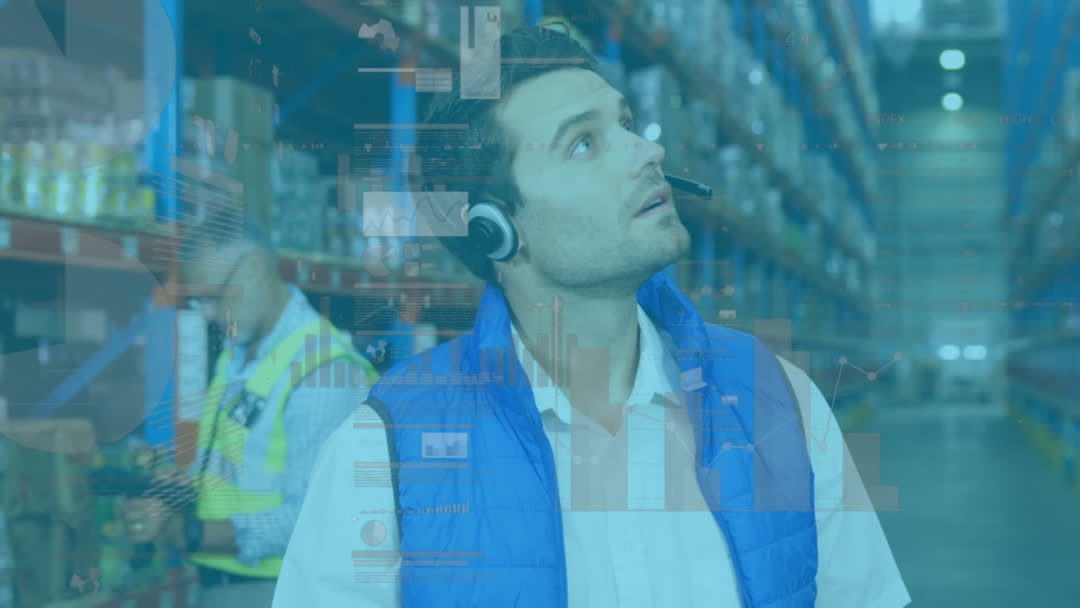 Man in warehouse wearing headset appears multitasking as overlay of digital data and graphs suggests integration of financial information with logistics operations. Useful for topics related to modern warehouse management, tech in distribution, and optimizing supply chains with advanced data processing tools. Could illustrate articles on improving warehouse efficiency or integrating business and tech solutions.