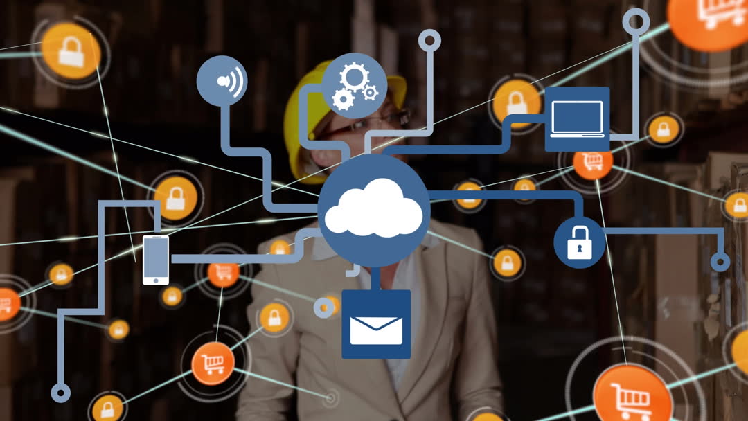 This video depicts a warehouse manager working in a vast storage area, symbolizing logistics and supply chain efficiency. The digital icons overlay represents smart logistics solutions and cloud-based management systems. Ideal for use in business presentations, articles on supply chain innovation, or marketing materials for logistic-focused enterprises.
