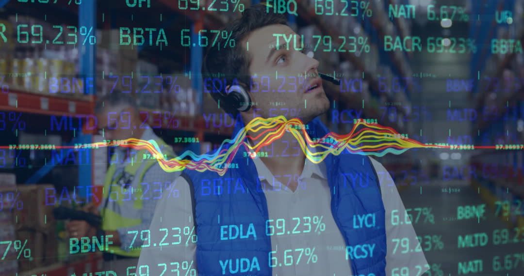 Overlay of financial data emphasizes the integration of business analytics in logistics. Useful for illustrating modern warehouse technology, business trends, data analytics, efficiency in inventory management.