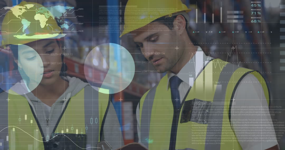 Two warehouse workers wearing safety vests and helmets engage with superimposed digital data and graphs. This is ideal for illustrating concepts of modern warehousing, inventory management, and integration of technology in logistical operations. Suitable for use in articles or presentations about industry 4.0, supply chain innovations, and digital transformation in industrial sectors.