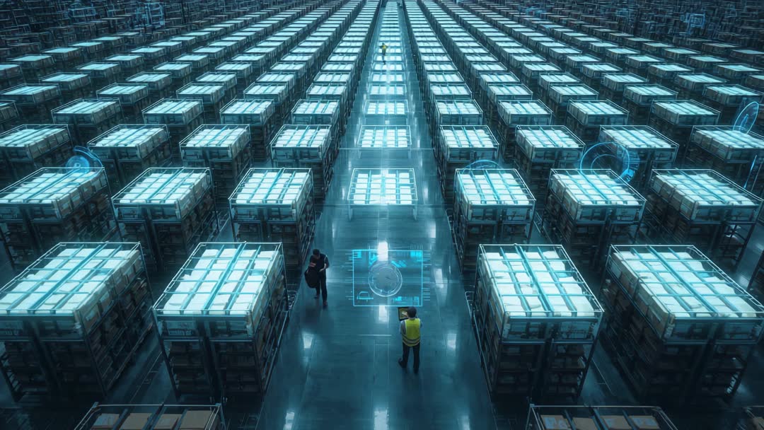 AI Generated Image. High-angle video showing long rows of pallet racks in modern warehouse. Two workers occupying center aisle; one wearing yellow safety vest standing and watching holographic floor projection while colleague entering from left scanning racks. Cold blue lighting and glowing holographic UI elements highlighting inventory locations and automated tracking points. Perspective emphasizing scale and repetition of pallets stretching into distance, creating dynamic visual for stories about smart logistics, automation, and AI-driven supply chain. Use for corporate presentations, technology advertisements, editorial features on warehouse automation, training content, and website hero backgrounds. Design tips: crop to wide banner for headline overlay, leave negative space along upper center for text, apply cool color grade to reinforce tech mood, loop short clip for ambient background.