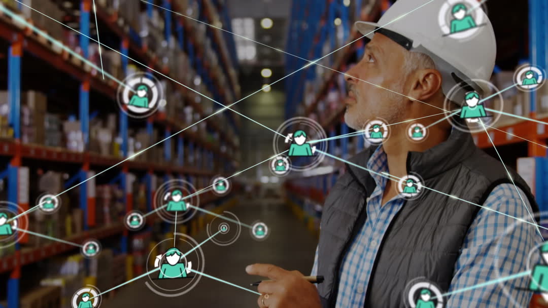 Male supervisor analyzing warehouse inventory with a digital network overlay. Connected profile icons represent cutting-edge network technology, essential for modern logistics and efficient inventory management. Ideal for illustrating concepts related to digital transformation, globalization, and technology-driven supply chain management in commercial settings. Useful for articles on warehouse optimization and technological advancements in business.