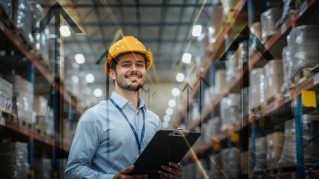 AI Generated Image. A supervisor wearing a safety helmet standing amidst a warehouse aisle, holding a clipboard while smiling confidently. Arrows pointing upwards and abstract graphics overlay suggest growth and efficiency. Suitable for illustrating themes like supply chain management, industrial productivity, leadership in logistics, and organizational success.