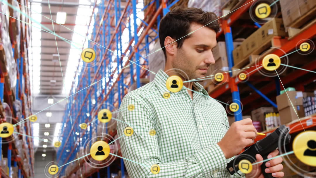 Warehouse supervisor checks inventory using a digital system with overlaid network icons symbolizing connectivity and logistics efficiency. Useful for illustrating modern warehousing management, supply chain technology advances, and workplace digital integration in business presentations or articles.