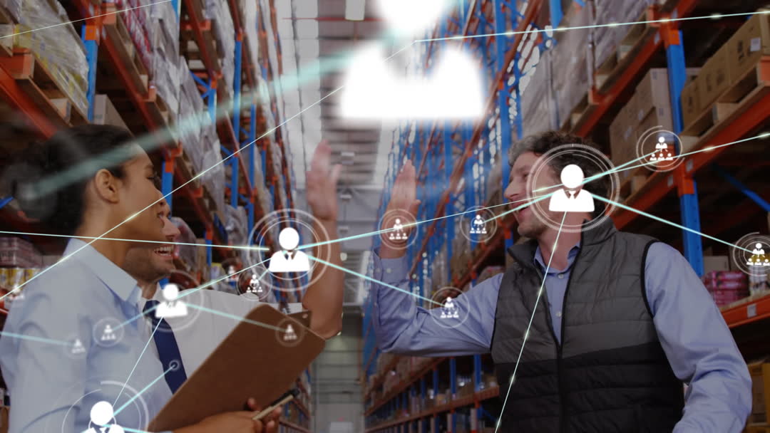 Warehouse Supervisors Celebrating Team Success with Digital Network Overlay Video