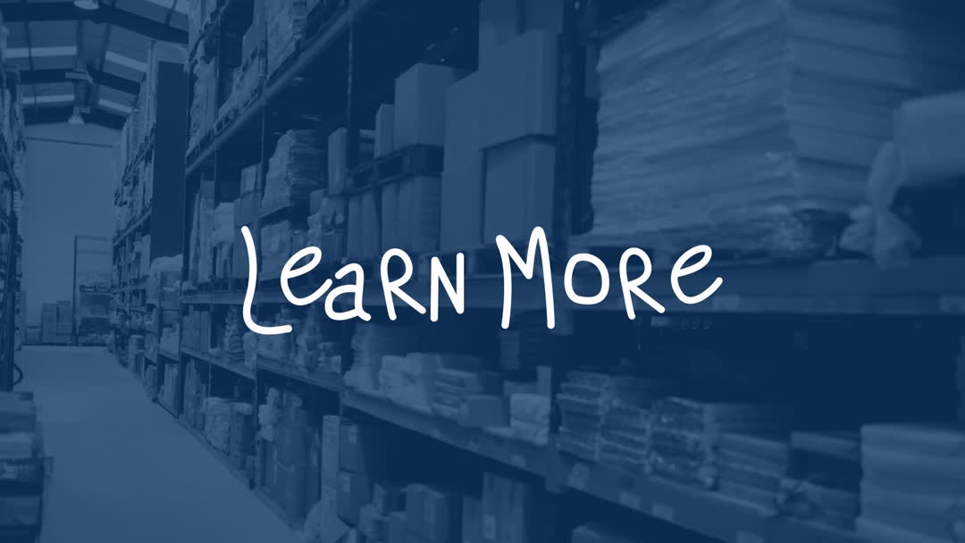 View of warehouse shelves laden with supplies and inventory, accompanied by 'Learn More' text overlay. Ideal for social media campaigns focused on logistics or educational content for digital interfaces and shipping industries.
