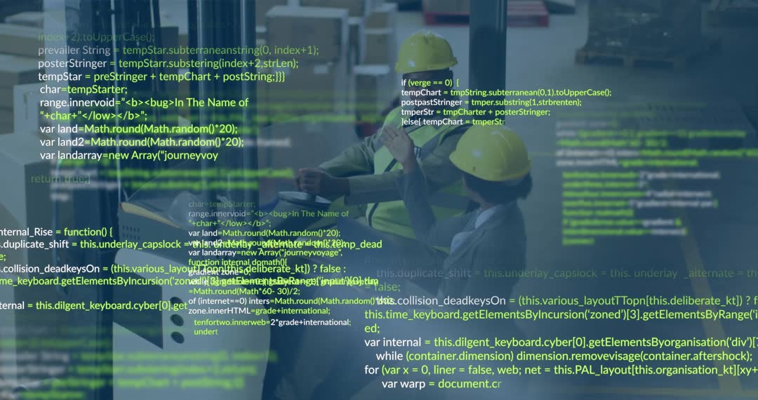 Warehouse environment featuring staff collaboratively reviewing plans overlaid with code, symbolizing integration of technology in logistics. Ideal for illustrating modern logistics processes, technology in industrial environments, and effective teamwork. Useful for publications on industrial advancements, technological integration, and logistics management strategies.