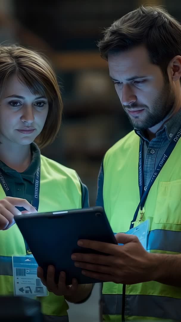 AI Generated Image. Vertical video showing two warehouse staff wearing high-visibility vests and ID badges, collaborating over tablet and checking inventory on touchscreen. Close-up framing highlighting focused expressions, hands interacting with device, and digital interface glow. Lighting conveying late-shift or controlled warehouse interior, creating professional and focused mood. Suitable for training videos, operations presentations, e-learning modules, safety and compliance messaging, recruitment and employer branding, logistics case studies, and mobile-first social media ads. Footage working well with subtitle overlays, on-screen graphics, step-by-step tutorials, and product demos for warehouse management systems or inventory apps. Recommended usage for supply chain websites, internal communications, advertising creatives, and instructional content.