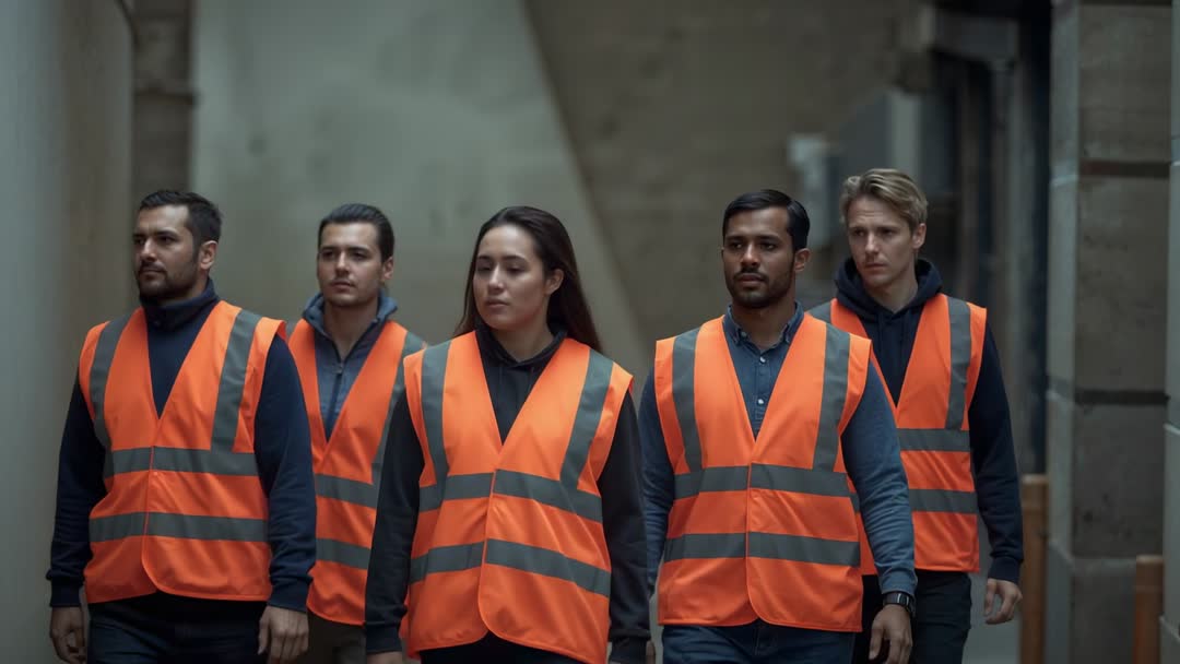 AI Generated Video. Featuring five workers walking through narrow corridor wearing orange high-visibility vests, moving with focused expressions and purposeful pace. Conveying teamwork, safety compliance, coordinated shift transition, and industrial professionalism for workplace narratives. Using for safety training videos, workplace safety campaigns, industrial operations tutorials, recruitment and HR presentations, and logistics branding. Usage ideas: using as opening clip for training modules, background visual for safety policy pages, social media posts promoting PPE compliance, corporate website hero banners, internal newsletters highlighting team unity. Filmmaking notes: capturing medium shot in low-light interior, emphasizing color contrast between orange vests and muted architecture, recommending voiceover or on-screen text for safety messaging.