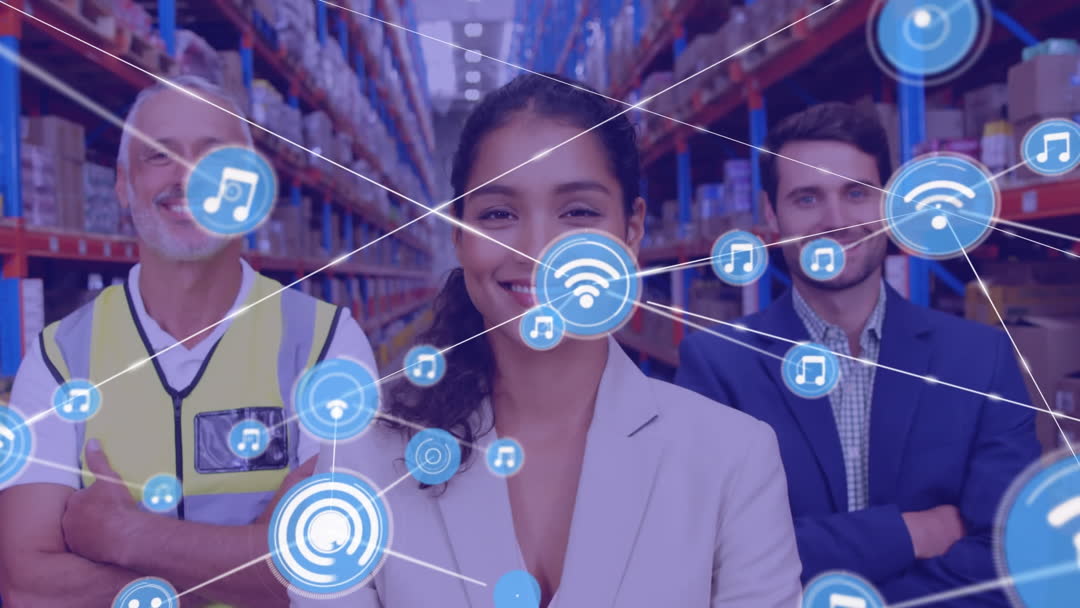 Diverse warehouse supervisory and worker team standing confidently, surrounded by digital icons signifying wireless networking, communication, and logistics technology. Ideal for use in materials promoting modern warehouse solutions, supply chain management, and business communication technologies.